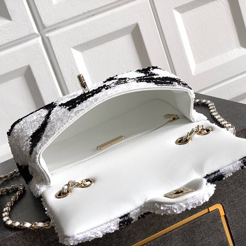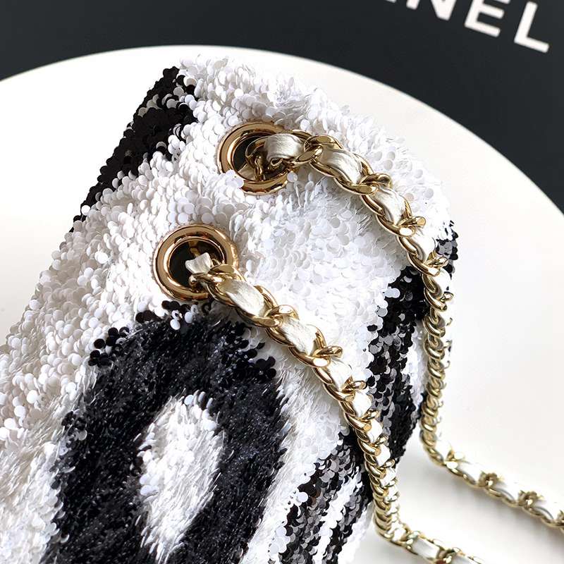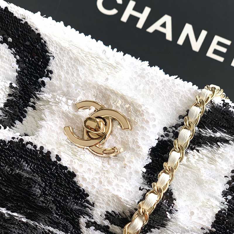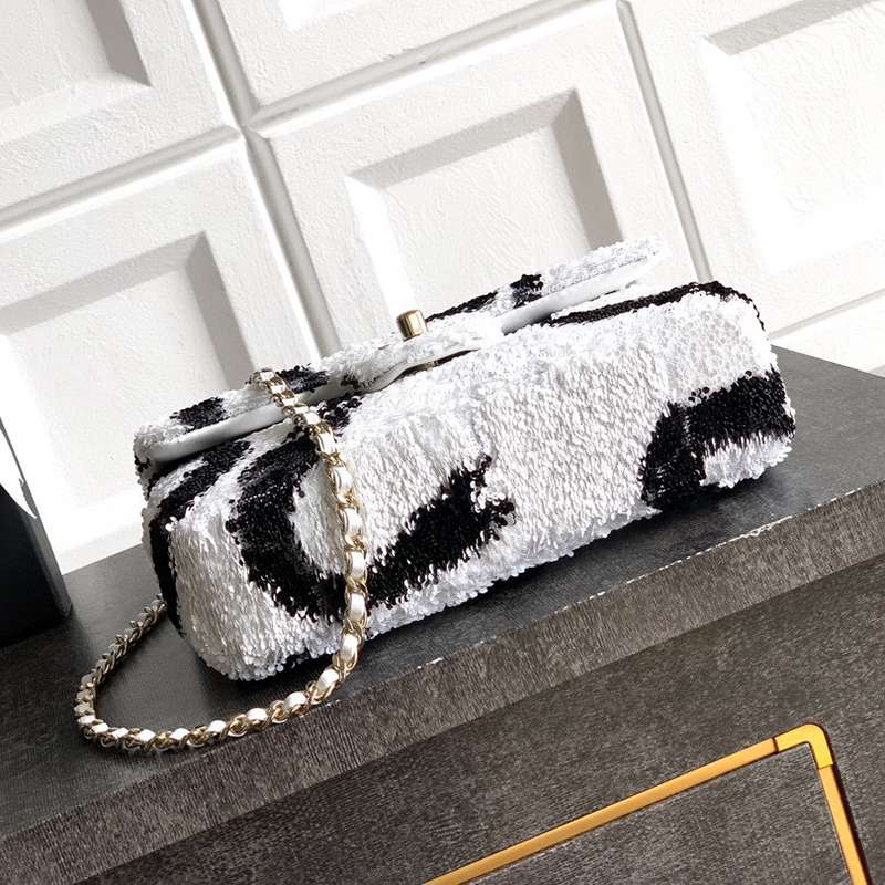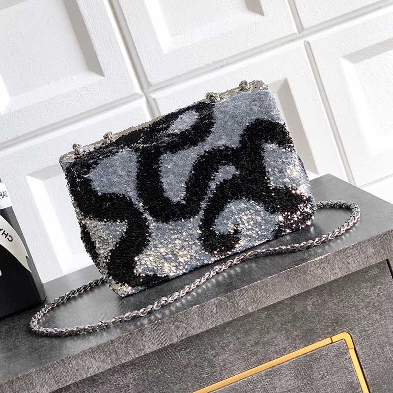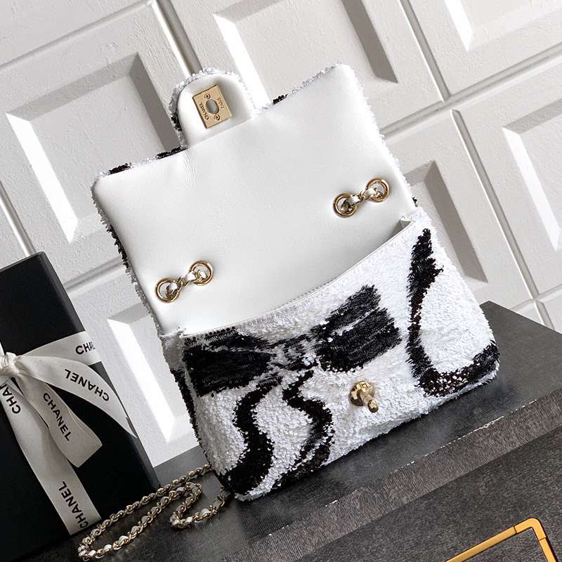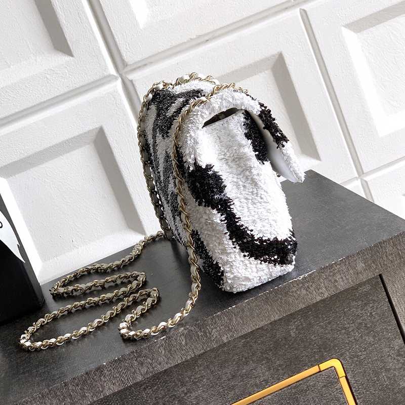 White Paired with Black "butterfly sequins, CHANEL 25K heavyweight high-end handmade workshop embroidery, dense sequins, shaped CF super shiny sequin bead bags can be pre ordered for autumn and winter filters, SO BLACK heart explosion street super cool c physical items are simply stunning, super rare explosive bead pieces, high cost performance, the most worthwhile bag to buy this season, the splicing of color flower sequins, sparkling and charming, simply infinitely magnifying its charm, elegant and fashionable temperament are synonymous with it, as well as a banquet bag that is also suitable for a lifetime collection of bags, 20cm