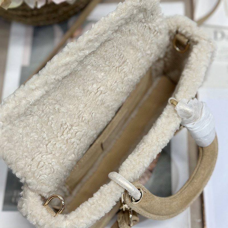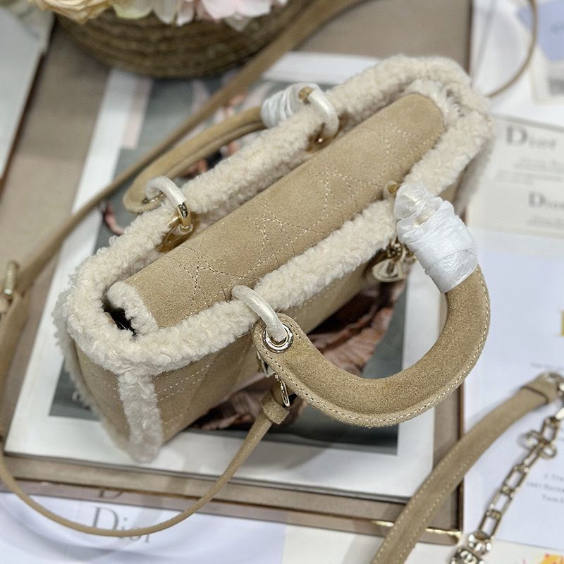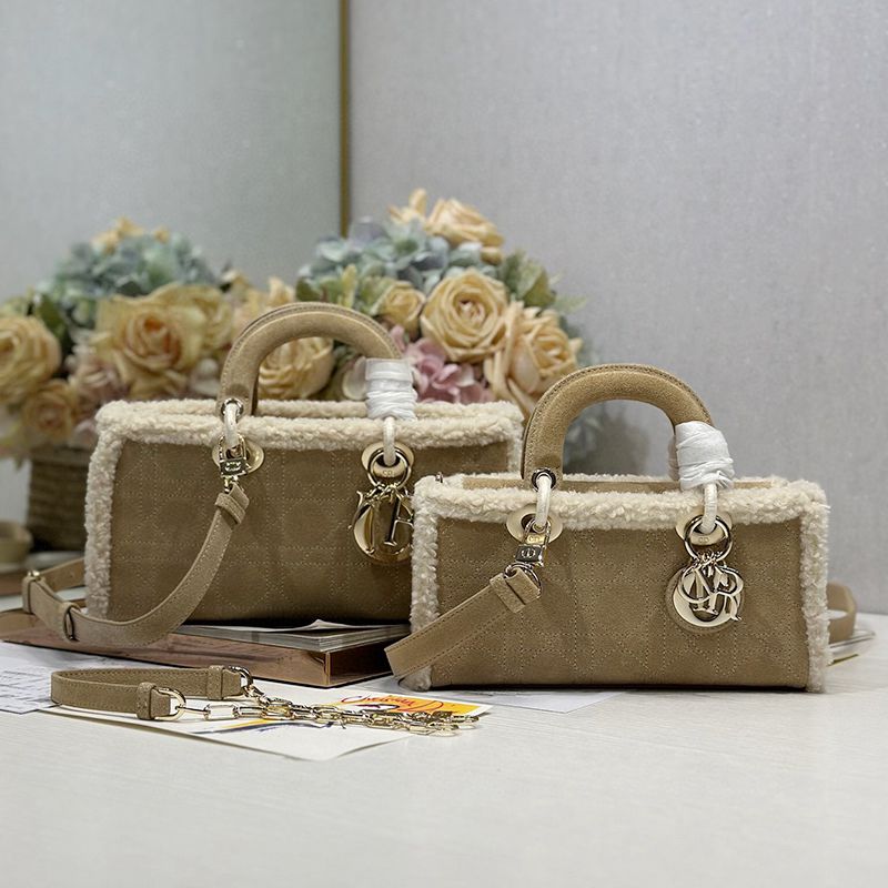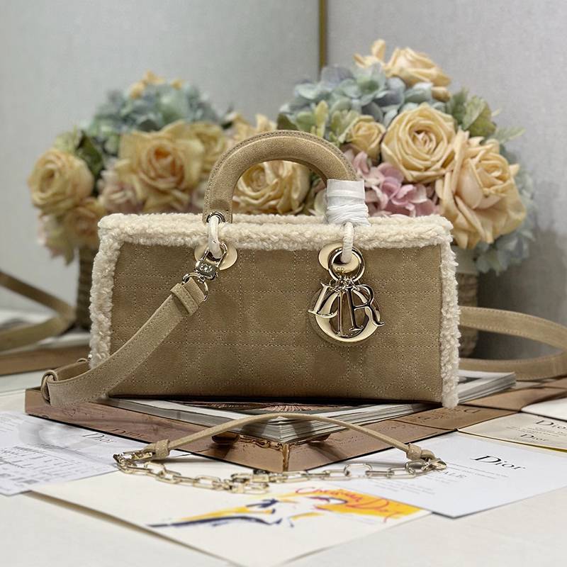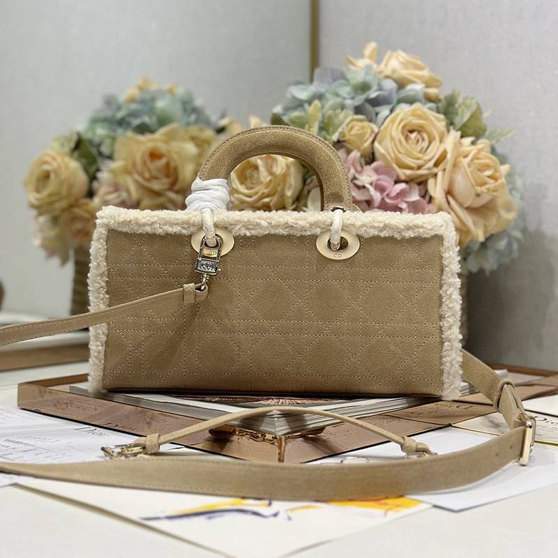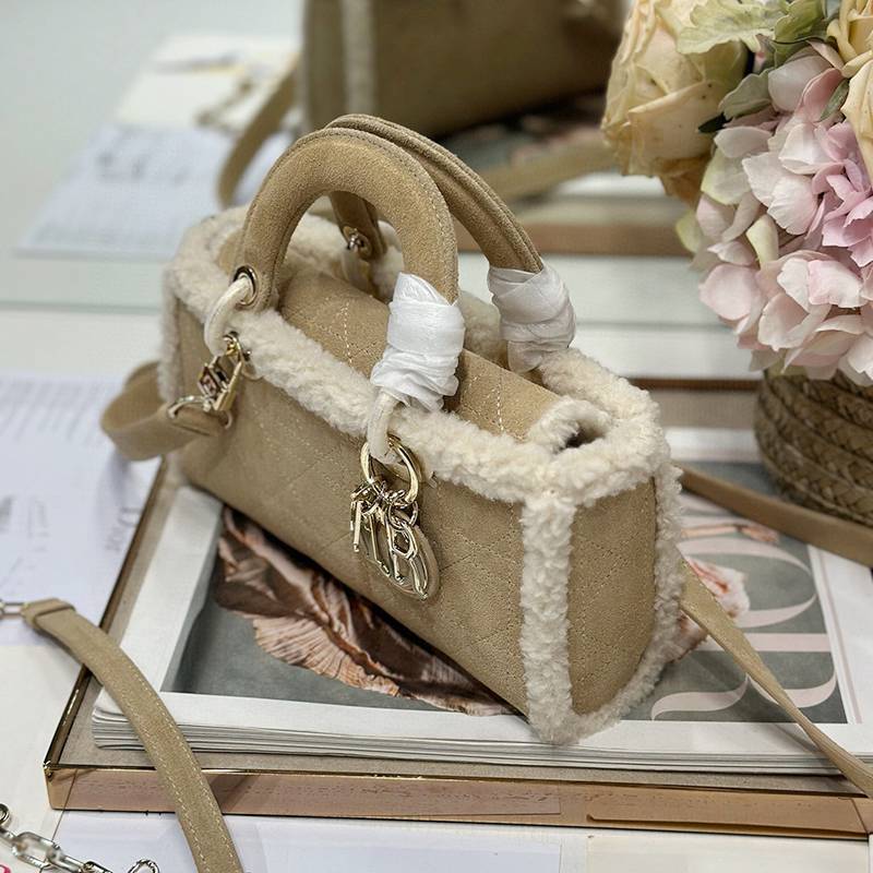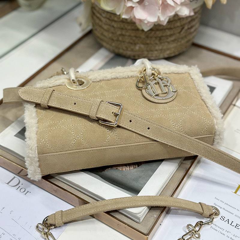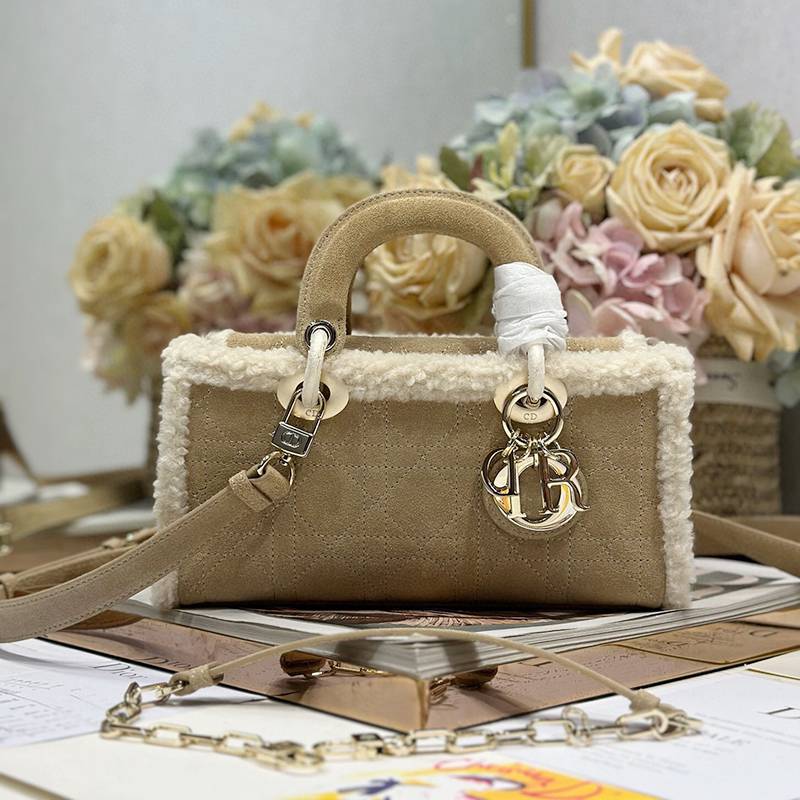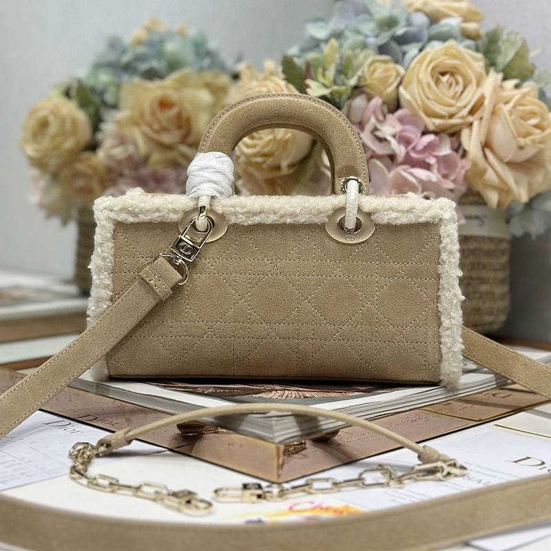The Lady D-Joy handbag "Apricot Beef Tendon Hair" embodies Dior's profound insight into elegance and beauty. Fashionable and elegant design will endure for a long time. Crafted with carefully crafted beige suede leather, adorned with rattan grain stitching and paired with off white cowhide fur, Dior showcases its exquisite craftsmanship. Paired with a light golden metal D.1.0.R. pendant, it adds a touch of liveliness to the exquisite silhouette. Small style, paired with detachable chain shoulder straps and adjustable, detachable suede shoulder straps, can be carried by hand or crossbody, making it an ideal daily companion. Detachable chain Detachable and adjustable leather shoulder straps Internal zipper pocket Can be paired with other Dior embroidered shoulder straps as desired Model: 0540/0910 Size: 22.5x5.5x12.5 cm (L x H x W) can hold 1 mobile phone, 1 clip, sunglasses and lipstick