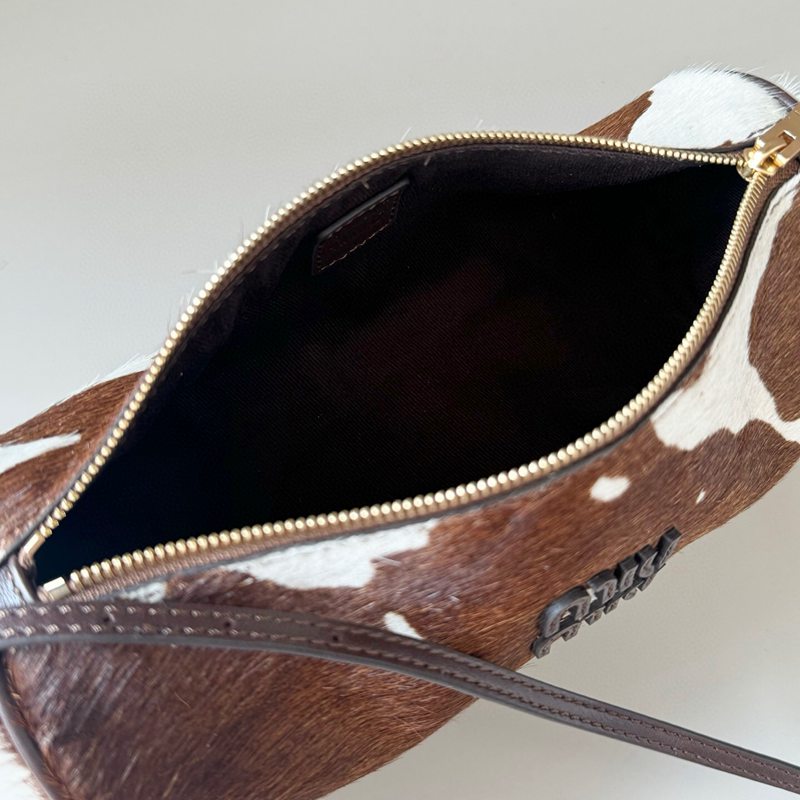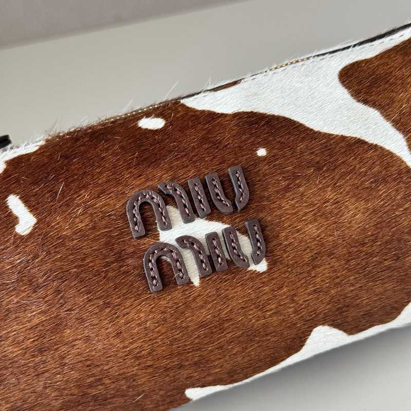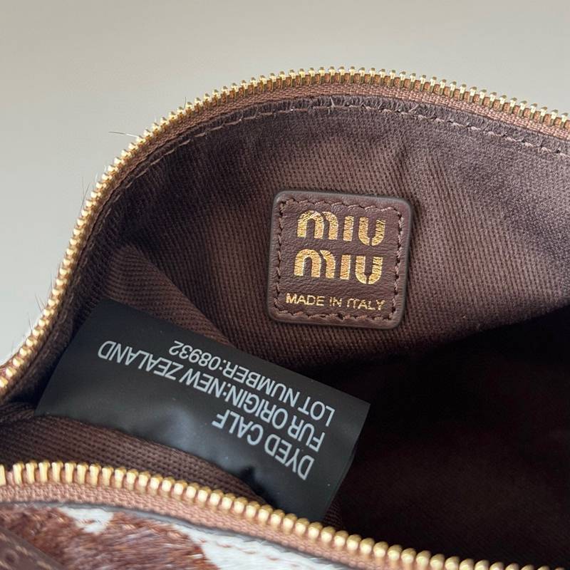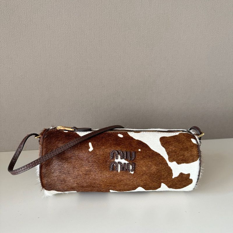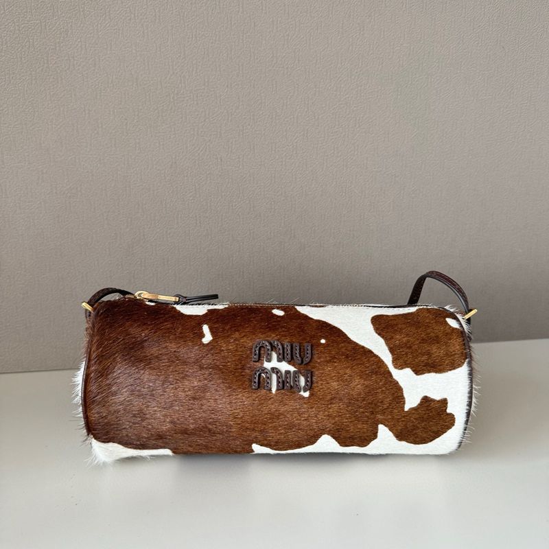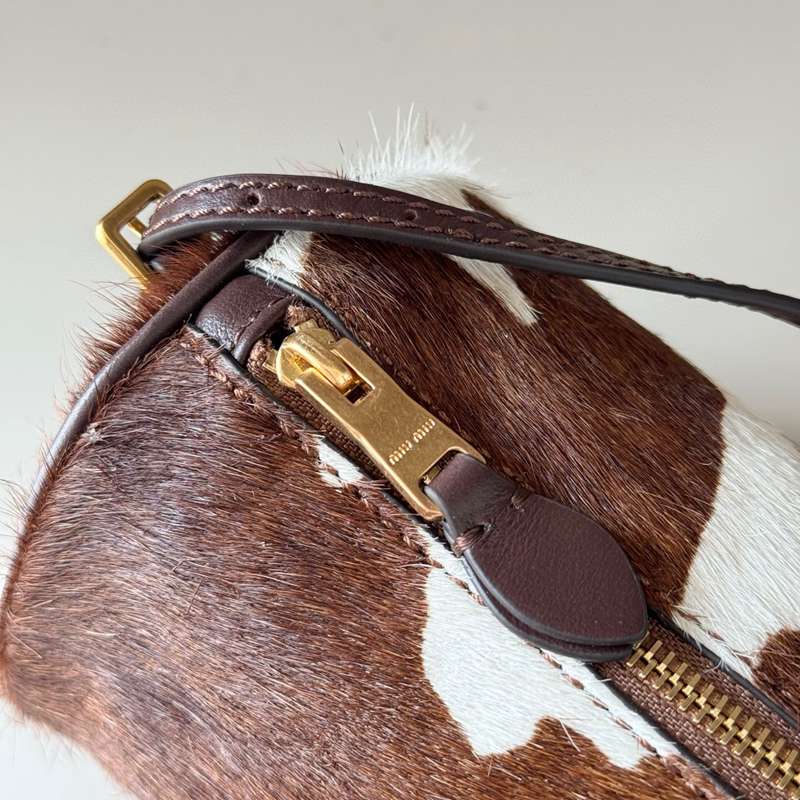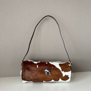 Home>Bags>Subaxillary package> ST29037 MIU MIU Cow Small Round Pen Holder Bag Retro Brown and White Contrasting Milk Year Pattern Fur Round Underarm Bag 5NE851
