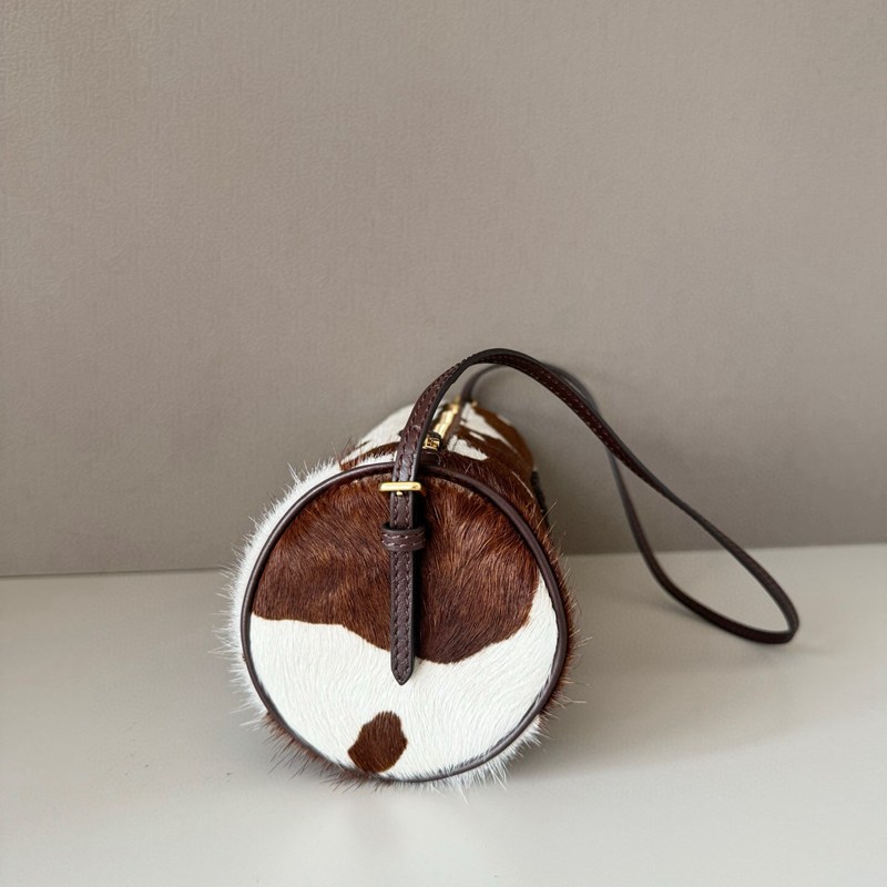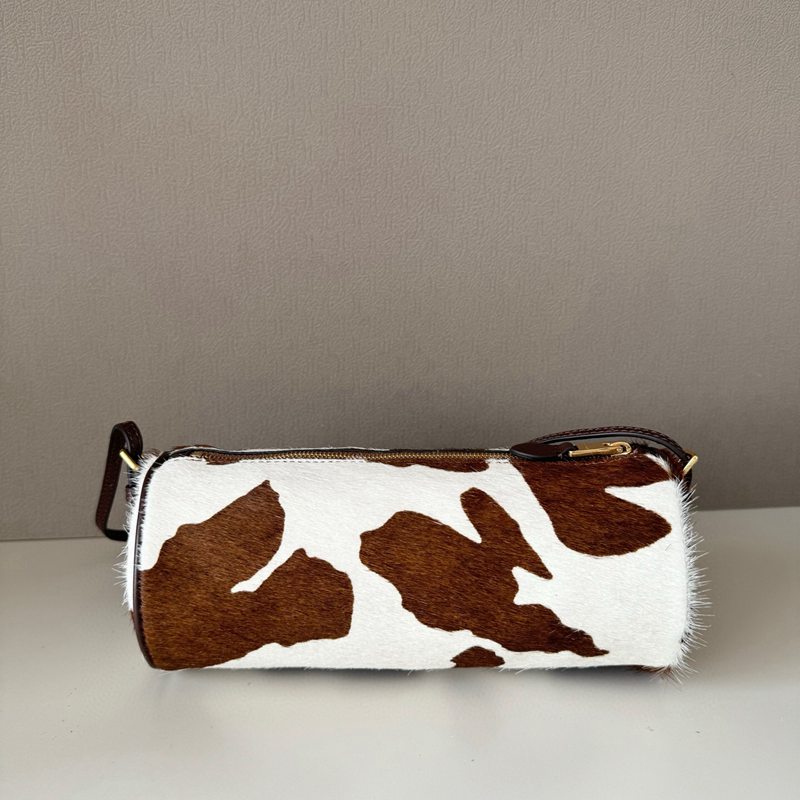 MIUMI Cow Small Round Pen Holder Bag blends retro wildness with girlish sweetness and coolness perfectly. The brown white contrasting cow patterned fur material comes with an eye-catching buff, and its round shape looks small, mini, and exquisite. It is indeed full of potential and has a considerable capacity. It can easily fit three mobile phones and can be carried on one shoulder, which is super beautiful. Tips are soft, sticky, and delicate, which is its advantage, but they are inevitably prone to scratches. A good bag is worth cherishing Style number: 5NE851 Cow size: Bottom length 22x width (diameter) 9.5x height 8.5cm