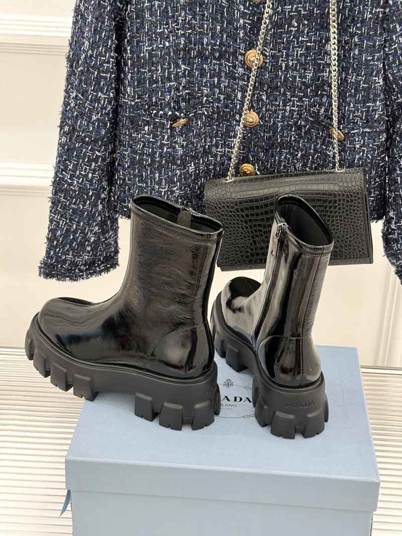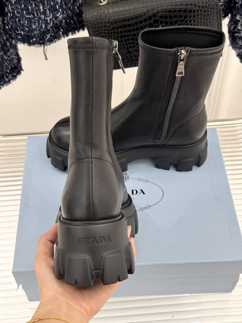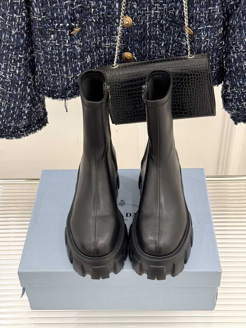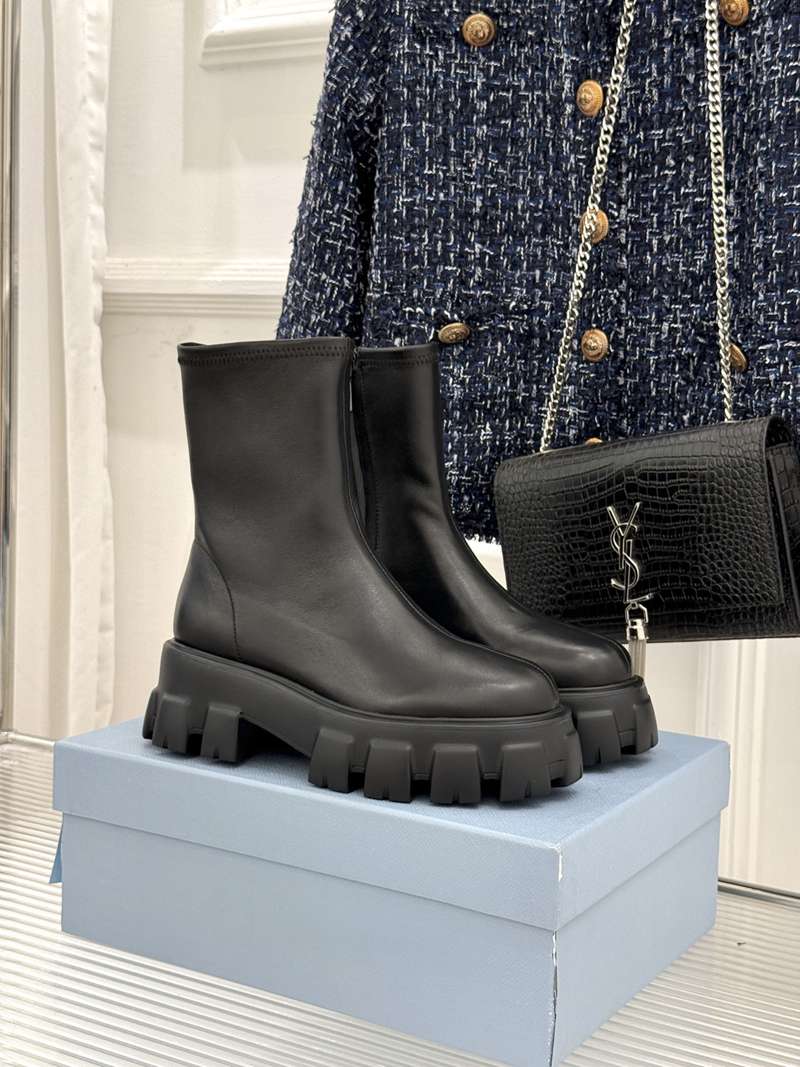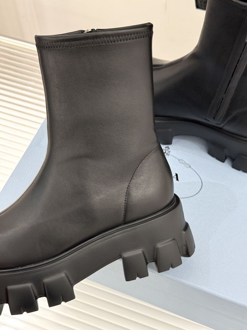 Prada classic triangle logo thick soled short boots wholesale The luxurious model of autumn and winter boots is a style declaration that transcends the trend cycle, focusing the brand's genes and unrestrained sharpness on every detail, Let pragmatism resonate perfectly with high-end texture, becoming a fashionable totem with its own aura when walking. The 16cm sharp boot tube precisely wraps around the ankle, and the minimalist round head design showcases a sleek and powerful posture. The customized metal zipper on the side of the shoe is the finishing touch, while the 5.5cm one-piece rubber sole hides a clever idea Tooth shaped convex design, achieving invisible height increase and optimizing body proportions The fabric is made of original imported cowhide Premium dyed sheepskin lining with tiptoes Original mold customized gear tooth sole