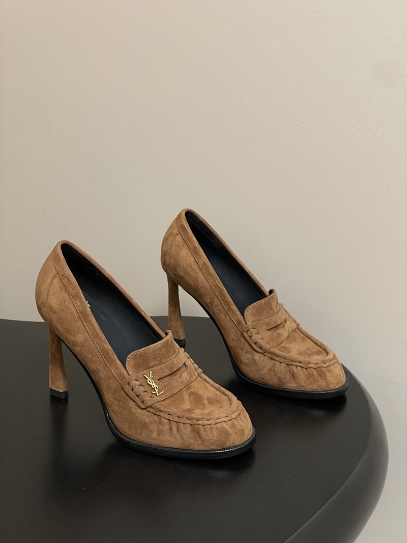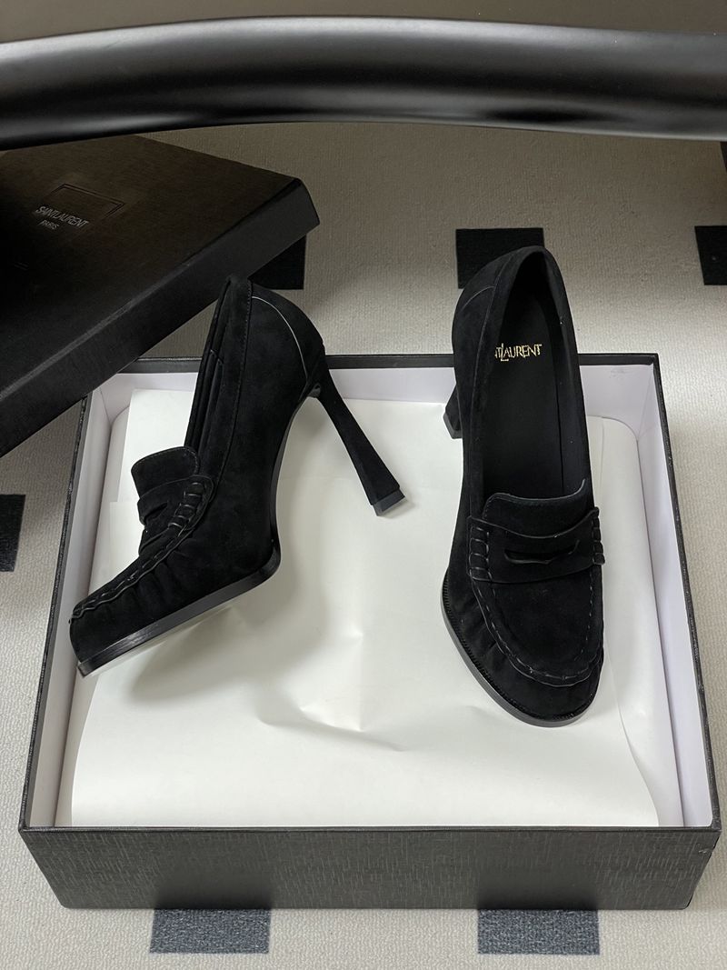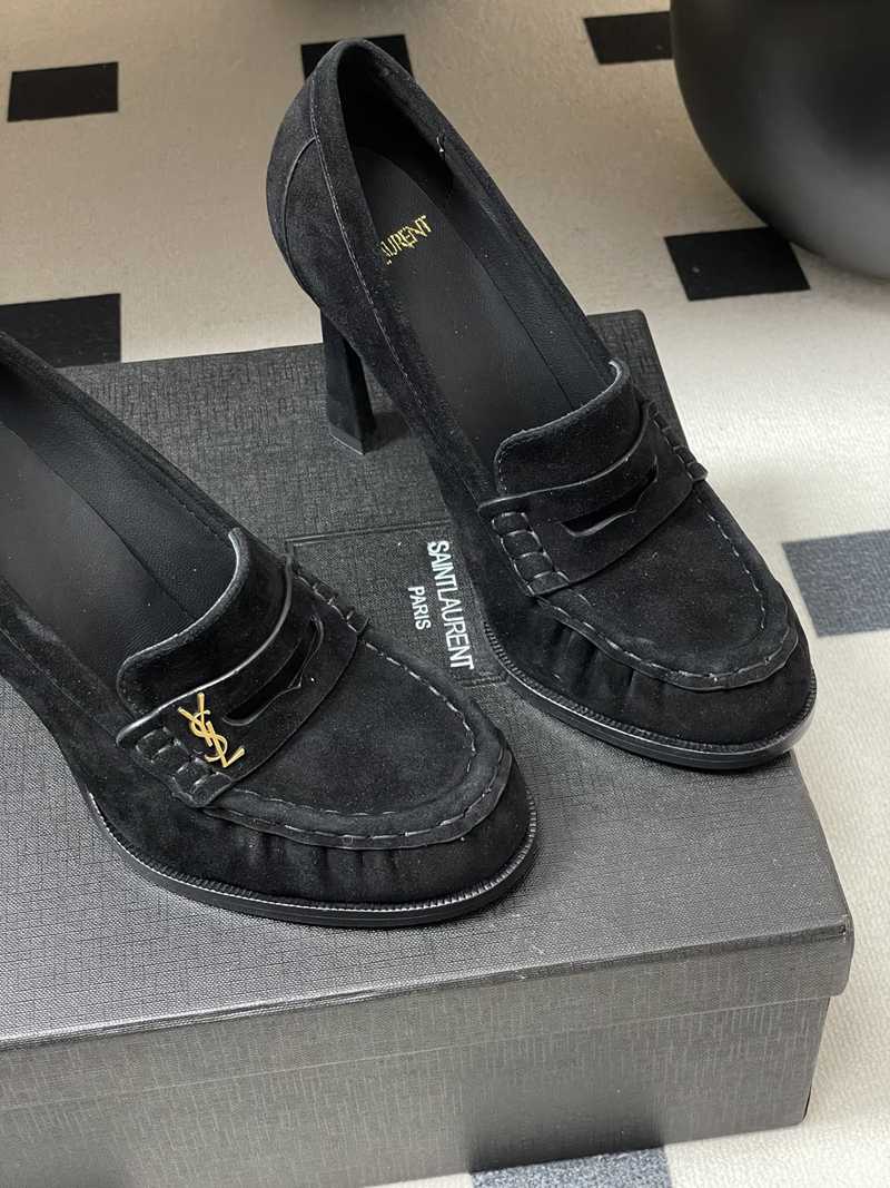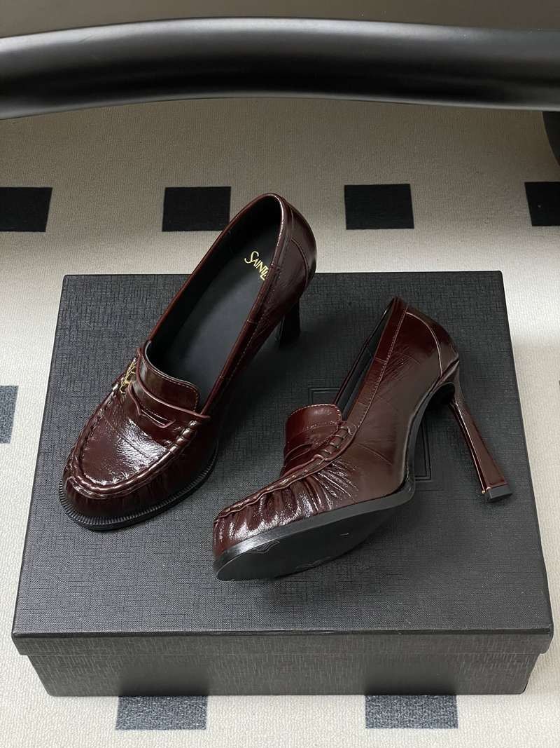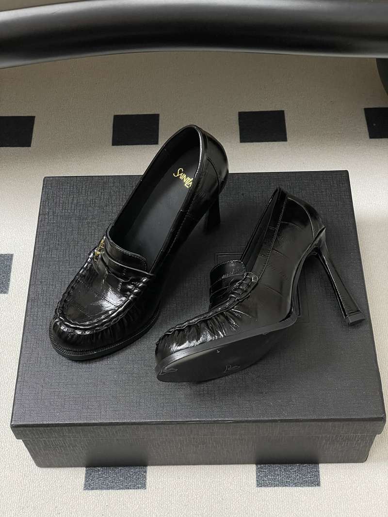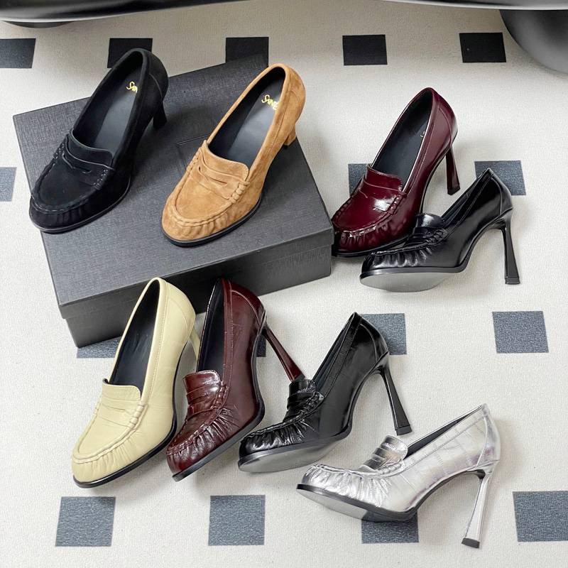 Saint Laurent Top Quality High Heels Lefu Shoe Series Wholesale Spring/Summer New Vintage Texture Eel Pattern Wrinkle High Heels Le Fu Shoes/Muller Shoes Suede Suede Old Money Style High Heels Single Shoes/Half Slippers One Step Casual Shoes Iconic pleated toe cap with handmade moxa stitching, featuring a vintage and relaxed feel; The shoe body features the classic one foot design of Le Fu shoes, paired with a metal YSL logo, which is simple yet recognizable. Leather lining+genuine leather outsole, with both texture and comfort in place. Strong style adaptability, suitable for both formal wear (suit/skirt) and casual wear, jeans/hoodies, creating a relaxed feeling, belonging to the "one shoe, multiple wear" light luxury item. Shoe upper: cowhide/tire cow suede/avocado leather Inner footrest: Silk sheepskin Sole: Italian double-layer thick leather outsole Heel height:10cm