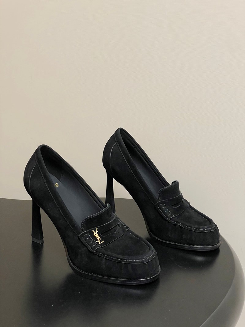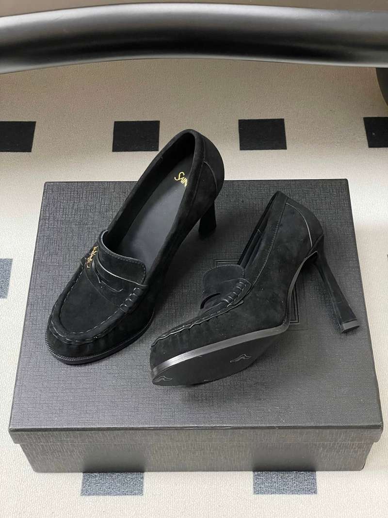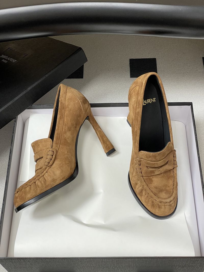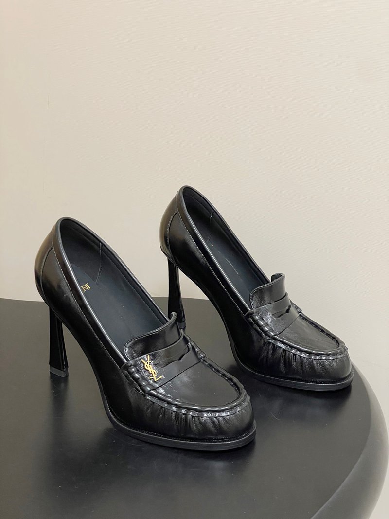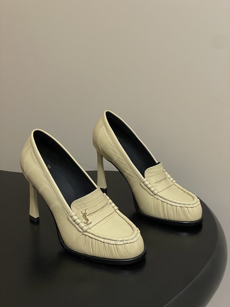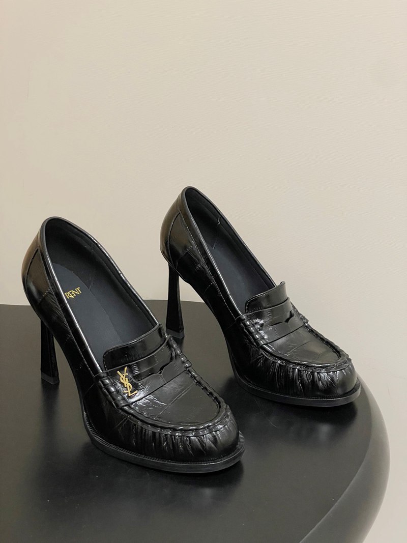Saint Laurent Top Quality High Heels Lefu Shoe Series Wholesale Spring/Summer New Vintage Texture Eel Pattern Wrinkle High Heels Le Fu Shoes/Muller Shoes Suede Suede Old Money Style High Heels Single Shoes/Half Slippers One Step Casual Shoes Iconic pleated toe cap with handmade moxa stitching, featuring a vintage and relaxed feel; The shoe body features the classic one foot design of Le Fu shoes, paired with a metal YSL logo, which is simple yet recognizable. Leather lining+genuine leather outsole, with both texture and comfort in place. Strong style adaptability, suitable for both formal wear (suit/skirt) and casual wear, jeans/hoodies, creating a relaxed feeling, belonging to the "one shoe, multiple wear" light luxury item. Shoe upper: cowhide/tire cow suede/avocado leather Inner footrest: Silk sheepskin Sole: Italian double-layer thick leather outsole Heel height:10cm