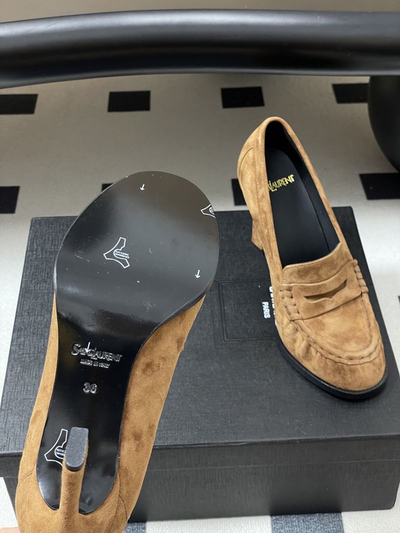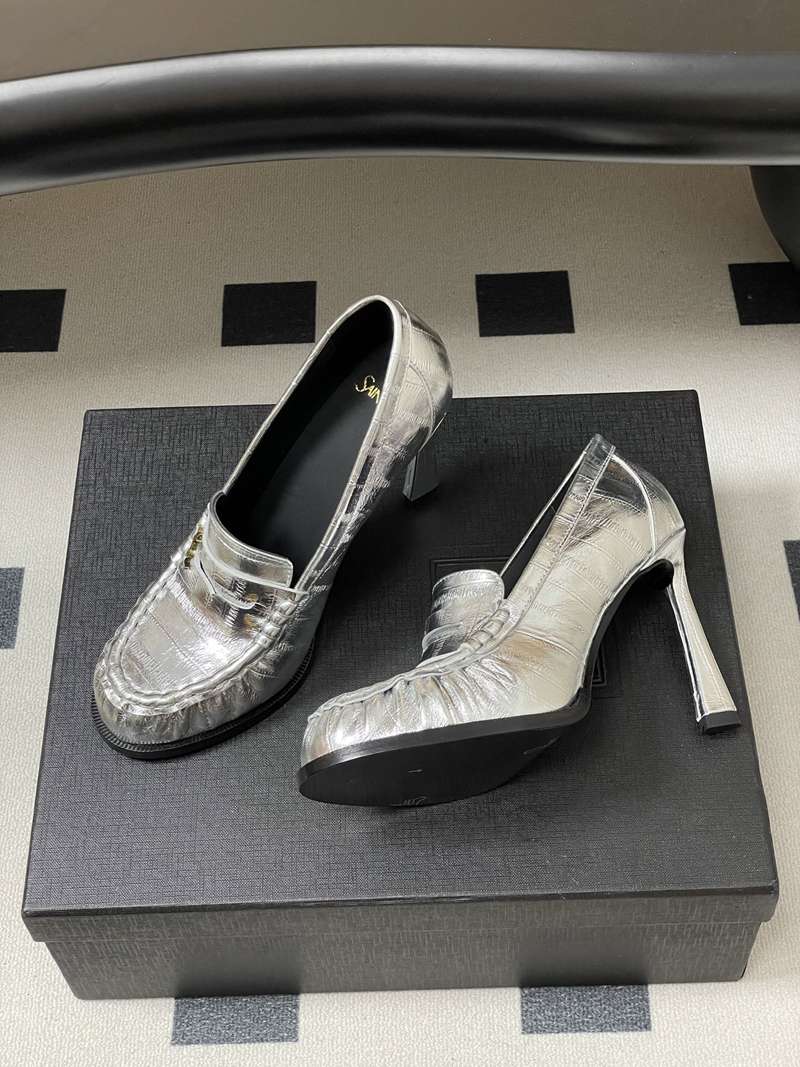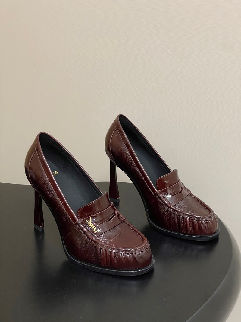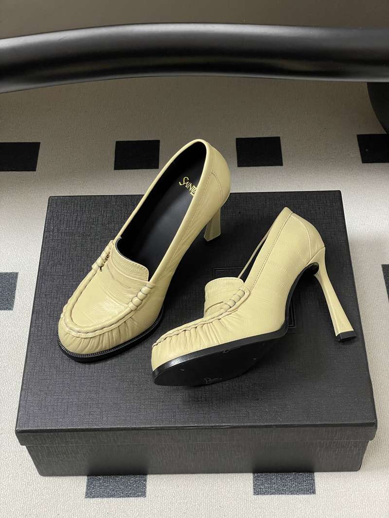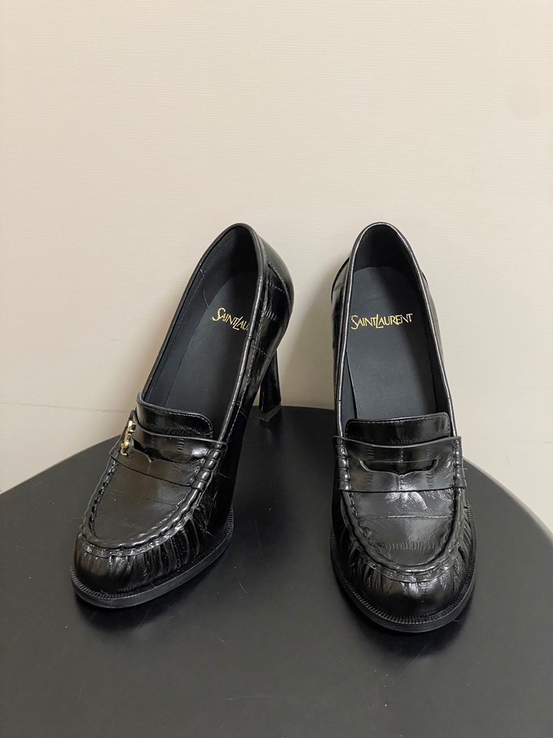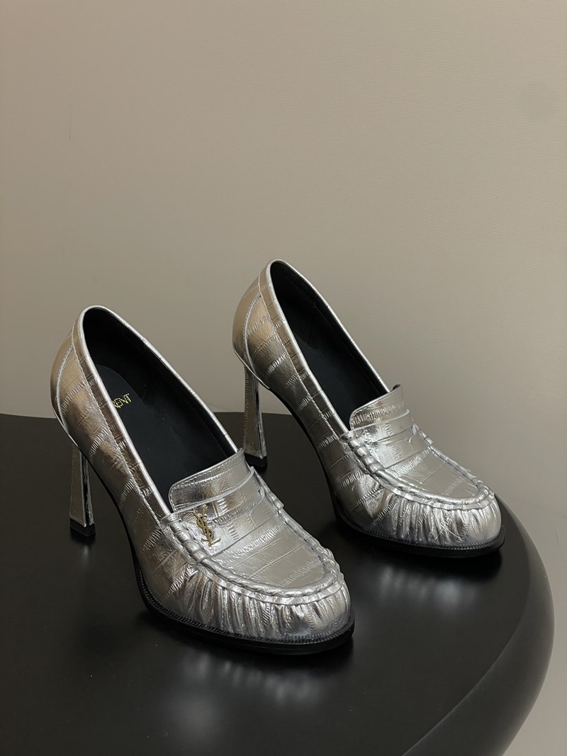 Saint Laurent Top Quality High Heels Lefu Shoe Series Wholesale Spring/Summer New Vintage Texture Eel Pattern Wrinkle High Heels Le Fu Shoes/Muller Shoes Suede Suede Old Money Style High Heels Single Shoes/Half Slippers One Step Casual Shoes Iconic pleated toe cap with handmade moxa stitching, featuring a vintage and relaxed feel; The shoe body features the classic one foot design of Le Fu shoes, paired with a metal YSL logo, which is simple yet recognizable. Leather lining+genuine leather outsole, with both texture and comfort in place. Strong style adaptability, suitable for both formal wear (suit/skirt) and casual wear, jeans/hoodies, creating a relaxed feeling, belonging to the "one shoe, multiple wear" light luxury item. Shoe upper: cowhide/tire cow suede/avocado leather Inner footrest: Silk sheepskin Sole: Italian double-layer thick leather outsole Heel height:10cm