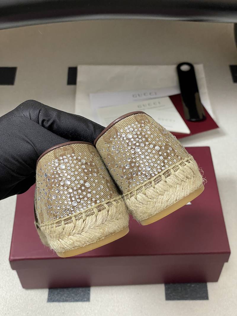 2026 Spring/Summer New Gucci G Home Crystal Diamond Fisherman's Shoes GG Fabric One Step Step Leg Leghorn Shoes Wholesale It's a perfect combination of fashion and comfort. The design is simple, classic, and atmospheric, making it versatile, comfortable, and high-end when worn The double G logo on the shoe upper showcases fashion charm, making it an essential item for goddesses in their summer shoe cabinet Upper: Customized Double G Canvas/Hot Drilled Inside: Sheepskin Sole: Non slip hemp rope rubber outsole